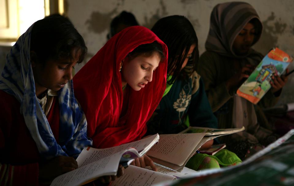 Children read from their books at a primary girls school in the Khairo Dero village in Larkana, Pakistan, on Wednesday, Jan. 23, 2008. Pakistan is seeking to sustain growth in a country where the government estimates a fourth of the population lives in poverty, or on less than a dollar a day. Photographer: Asim Hafeez/Bloomberg News